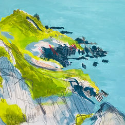 These expressive works cleverly combine painting with drawing and mark making. Kate has a natural mastery with colour, adding gestural details of coastal plants and rock formations she reveals the beauty and fragility of our coasts. Walking the coastline with her sketch books, and art materials, making small paintings and studies, she documents and collects all she needs to create larger works back in her studio.